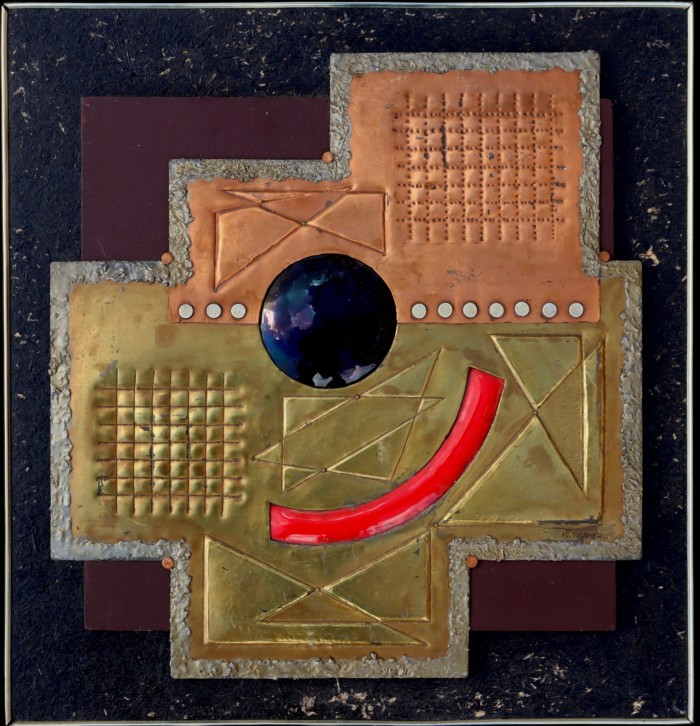 Raymond Trameau 1897-1985 technique mixte sur panneau d’aggloméré peint noir 41 X 39 cm, alliant émaux sur cuivre, cuivre jaune et cuivre rouge ciselé bordés d’étain. Artiste protéiforme, Trameau fut aussi bien peintre, sculpteur, céramiste et également un des meilleurs émailleurs de son époque, figuratif tendance cubiste à ses débuts, avant d’évoluer vers une abstraction