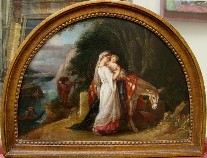 Ecole française 19ème siècle Vers 1820/30, huile sur toile 24,5 X 33 cm, montée par une marie-louise dans un cadre restauration un peu accidenté 38 X 46 cm. «Dans son jus», l’œuvre a été recoupée et rempliée sur les côtés droit et supérieur, et présente d’anciennes restaurations. Ce paysage, caractéristique de cette période où oeuvrèrent